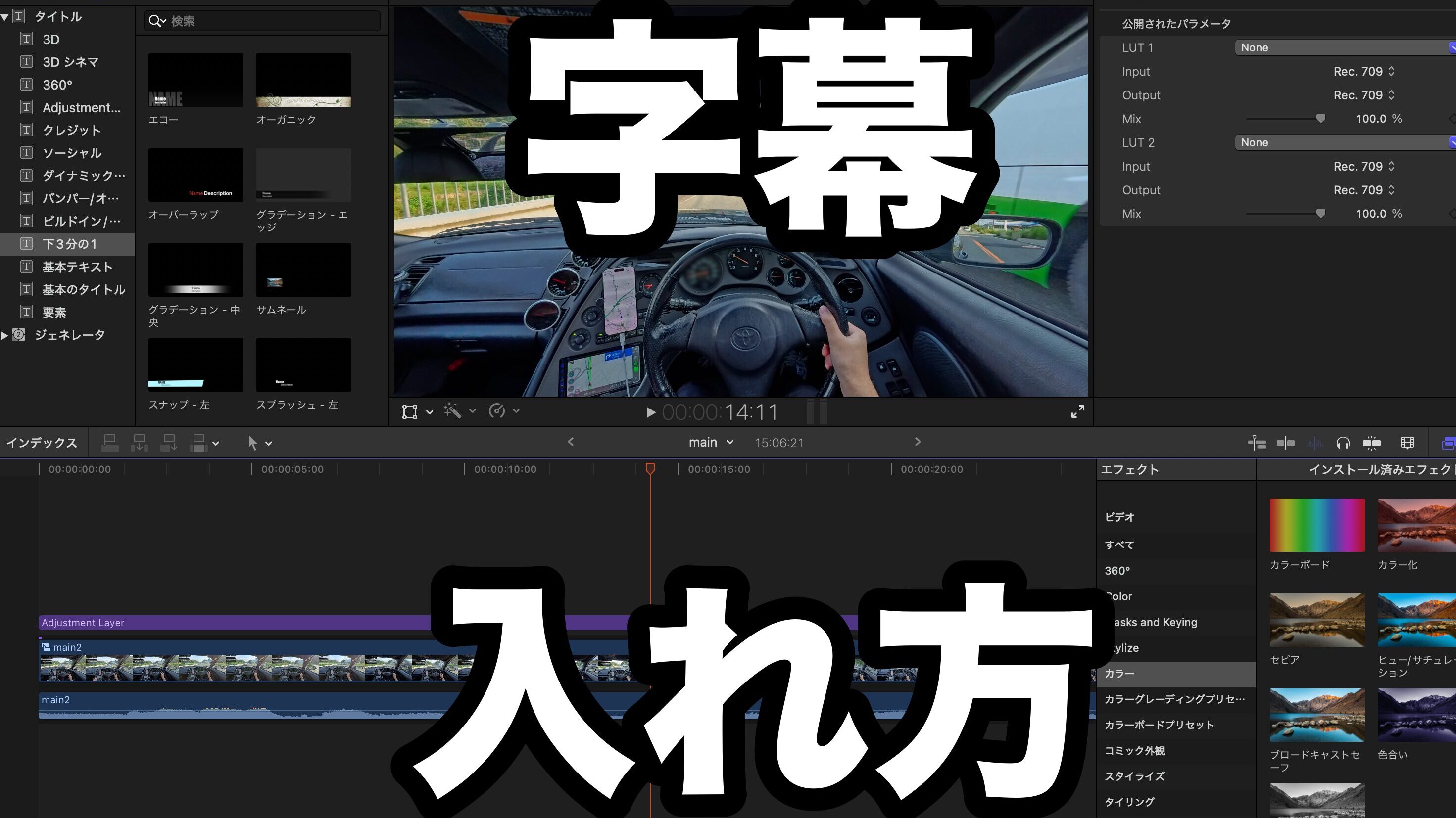 Final Cut Pro (FCP) に乗り換えてから1ヶ月ちょい経った。頑張った甲斐もあり基本操作には慣れてきたんだけど、先日字幕の入れ方がわからなくて困った。俺はこんな初歩的なこともできなくなってしまったのか、と思ったんだけど、単純に難易度というより場所がわからない。 調べて字幕を入れることはできたんだけど、そのままだとどうせすぐ忘れるから忘れないように、忘れた時に俺が見れるように、同じように字幕の入れ方がわからない人のために書き残す。 Final Cut Proで字幕を入れるやり方 「タイトルとジ ...